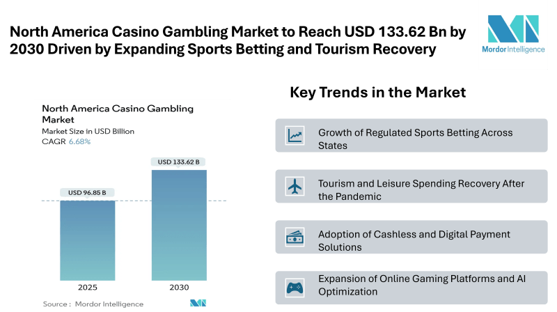 According to Mordor Intelligence, the North America casino gambling market size reached USD 96.85 billion in 2025 and is projected to climb to USD 133.62 billion by 2030, reflecting a 6.68% CAGR. Rising interest in sports betting, alongside conventional table games and slot machines, is boosting overall revenues and contributing to a larger North America casino gambling market share.